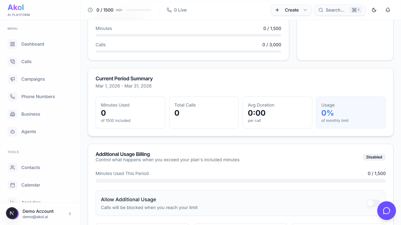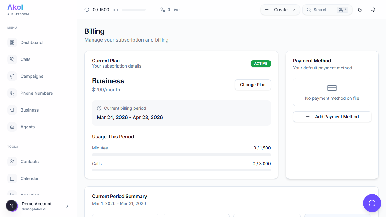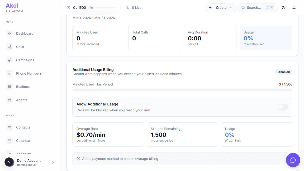 View your usage, change your plan, update payment details, and manage your billing — all from the dashboard.
