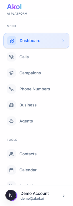 When you log into Akol, you land on your dashboard. This is your home base — everything you need to run your AI phone agent is right here.