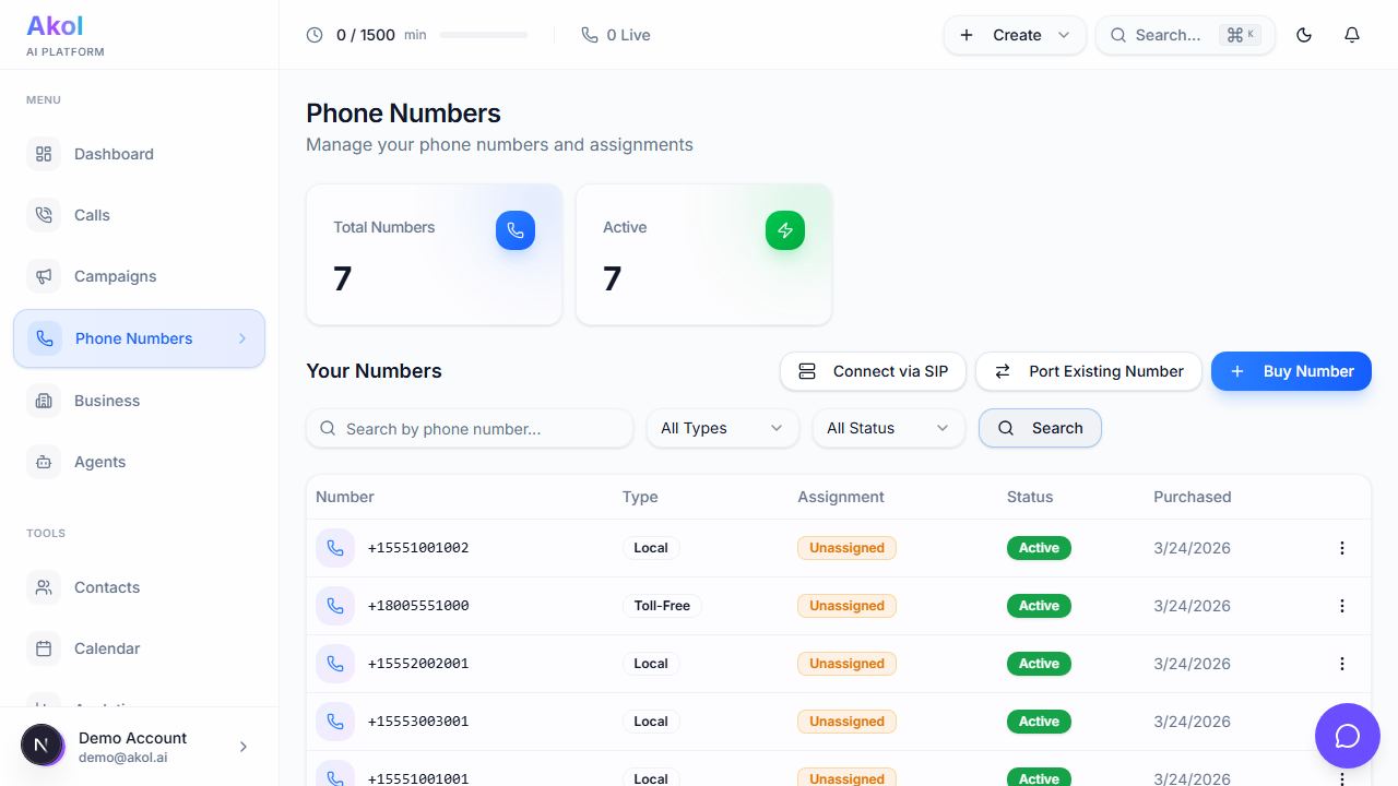 Your AI agent needs a phone number so customers can reach it. You can buy a new number through Akol or forward your existing business number.